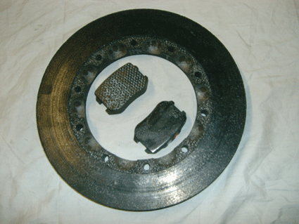 Bremsscheibe mit einem neuen und einem gebrauchten Bremsbelag aus der Formel 1 Scheiben und Beläge aus Kohlefaser-Verbundwerkstoff.